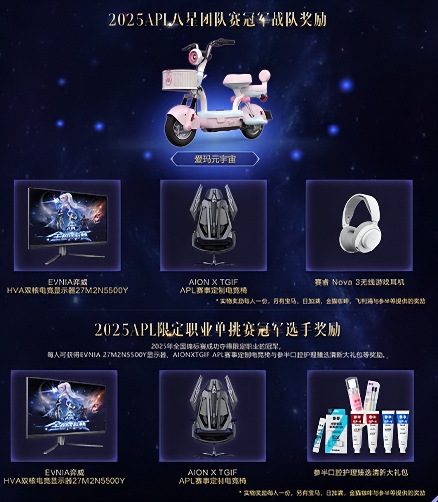 终极决战今日开启!全服瞩目的永恒之塔总决赛已经打响,总冠军战队将摘得2025APL冠军战队荣耀奖杯,战队成员每人可获得爱玛元宇宙、AIONXTGIF APL赛事定制电竞椅、EVNIA 27M2N5500Y显示器、赛睿Nova 3无线游戏耳机等赞助奖励。成功夺得限定职业的冠军,每人可获EVNIA27M2N5500Y显示器、AIONXTGIF APL赛事定制电竞椅与参半口腔护理臻选清新大礼包等奖励。这不仅是团队的荣耀角逐,更是个人实力的终极证明。无论是一直支持某支战队的铁杆粉丝,还是被某位选手超凡操作折服的见证者,此刻,都是我们凝聚信念的时刻。