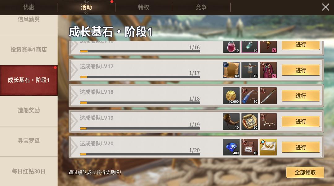 游戏特别设计了"成长基石"双阶段成长计划。第一阶段,玩家通过提升船队等级即可获得蓝钻、装备与海量素材;第二阶段随着等级提升,还能解锁各类装备外观、达克特(金币)、金翼船锚等珍贵资源。这种阶梯式成长设计让新玩家每个阶段都有明确目标,享受持续成长的成就感。