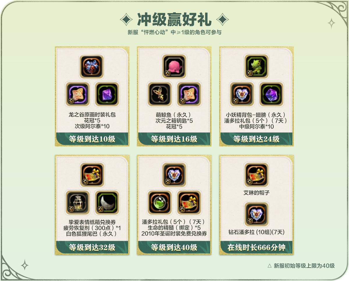 想要轻松升级?想要免费时装、免费头饰、免费潘多拉和各种各样的成长材料,躺着就把福利给领齐?或者,热爱冒险的你,想要再一次体验备战海龙巢穴的热血激昂、铸就新一代的屠龙传奇?2026年1月6日,来《龙之谷》怀旧服“怦燃心动”新服,冲级就能赢好礼。新服开服时,等级上限40级。升级到指定等级,就送原画时装、花冠、萌鲸鱼、小妖精背包、挚爱表情纸箱兑换券、白色狐狸尾巴、圣诞时装免费兑换券、钻石潘多拉礼包等等奖励!完成强化、通关巢穴等任务,还有海量龙币送!每周一至周日,活动时段升级经验+100%。每周末高峰时间,还有掉率+50%增益,全员可享哦!